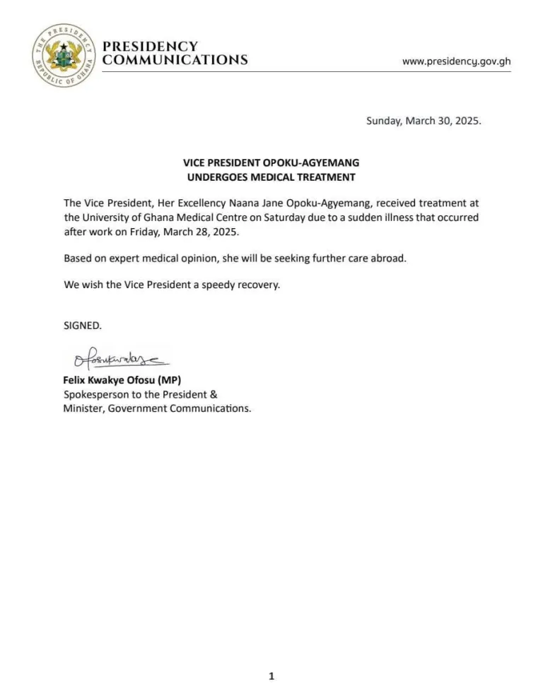 Ghana’s Vice President, Prof. Naana Jane Opoku-Agyemang, has undergone medical treatment at the University of Ghana Medical Center following a sudden illness.